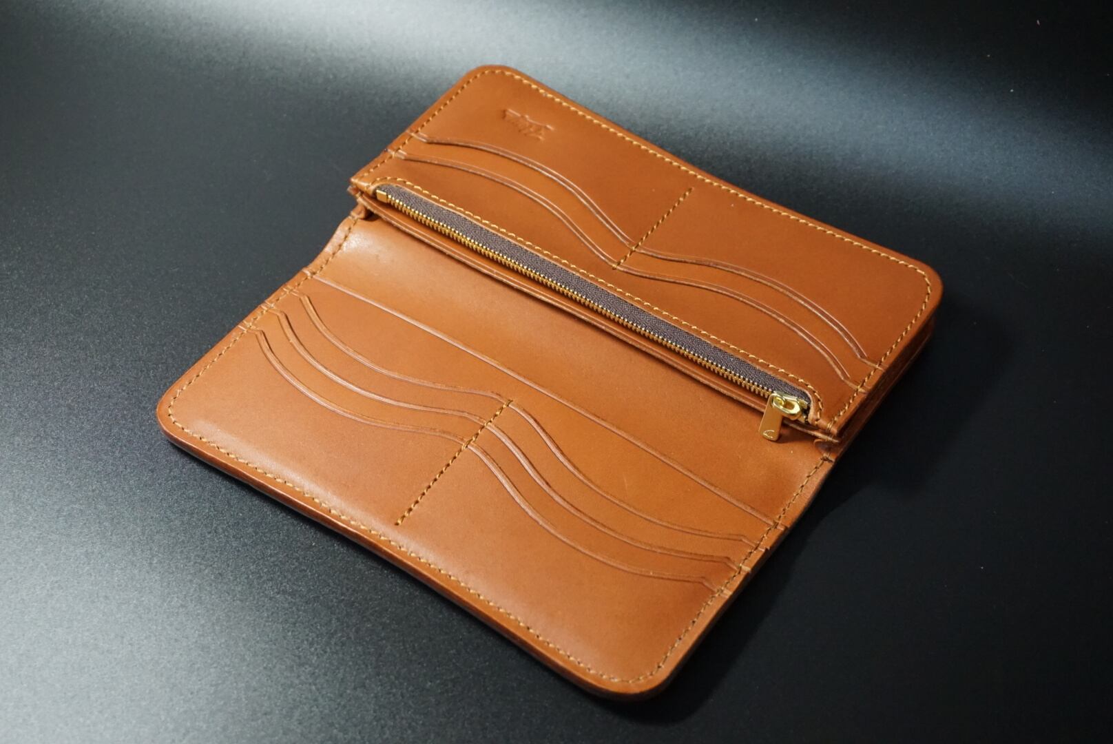 オイルレザーを使用した二つ折りウォレットのイントレチャート仕様です。カラーをお選びいただけます。